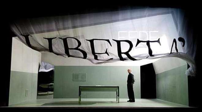 Doppio, demonio, alter ego, coscienza, o forse proprio quel libero arbitrio che gioca a braccio di ferro con la fede, e che costituisce – nel racconto di Dostoevskij – il peggior regalo lasciato da Gesù. E infatti, proprio la scritta “LIBERTÀ” piomba dall’alto chiudendo lo spazio a mo’ di quarta parete. La libertà chiude, imprigiona, perfeziona la claustrofobia nella quale si dibatte l’uomo: la calata della cortina su cui è riportata questa parola è l’immagine più evidente del discorso dell’Inquisitore a Gesù.