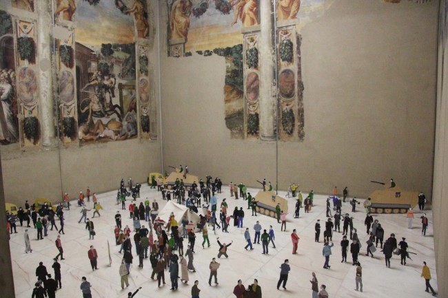 Proprio dall’Egitto arrivano due opere che sembrano ricalcare la stessa necessità, non solo tematica ma anche materiale. Il racconto comune è quello, ancora una volta, che parte dalla rivoluzione del 2011, e cioè le proteste di piazza Tahrir, per estendersi a tutte le proteste di questi incandescenti anni egiziani. Lo sforzo di Hany Rashed (nato al Cairo nel 1975) e Moataz Nasr (nato ad Alessandria nel 1961) è quello di rendere materiale – fisica – la memoria e di rendere tangibile la partecipazione popolare, intesa non come massa ma come pluralità di individui che formano la società egiziana. In Tahrir Square (2014) Rashed ricostruisce con tante sagome di legno colorate il dispiegamento di dimostranti e polizia in piazza durante l’occupazione. Di fatto, in questo modo, Rashed “occupa” a sua volta una sala intera (ed è suggestivo che si tratti di una sala con brandelli di affreschi quattrocenteschi), non solo rievocando, ma facendo abitare quella sala-piazza da una miriade di presenze che mostrano la dinamica di uno scontro in atto. Il dispiegamento delle figurine ha qualcosa del gioco infantile, e per questo impone al visitatore uno scarto nello sguardo. Uno scarto nel visitatore egiziano, che può riconoscere particolari noti o anche il fatto che l’installazione nasca dalla sovrapposizione temporale di diversi fatti accaduti nello stesso luogo. E uno scarto nel visitatore estraneo, che può cogliere soprattutto lo scollamento tra l’apparente tranquillità delle persone raffigurate e la drammaticità delle sagome dei carri armati che fanno da sfondo e soprattutto della figura centrale con le braccia alzate, attorno a cui tutto sembra ruotare come un maëlstrom colorato.