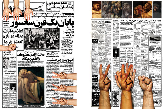 Dunque, parlare di arte in Iran ha un peso fortemente politico di per sé, e il lavoro di Jinoos Taghizadeh (nata a Teheran nel 1971) Rock Paper Scissors, creato nel 2009, in occasione del trentesimo anniversario della rivoluzione, ne è forse l’esempio più eclatante: una serie di collage di giornali che parlano della caduta dello scià e dell’ascesa di Khomeini, sui quali sono sovrapposte immagini da Bosch e Bruegel, con infine una terza sovrapposizione di mani che giocano a sasso-forbice-carta. Dunque, la celebrazione della rivoluzione su cui agisce l’immaginario inquietante dei fiamminghi, il tutto annegato nella ludica casualità di un gioco di fortuna: politica (i quotidiani come frammenti di realtà), incubo (la rievocazione dei fiamminghi: fantasia) e la quotidianità (con il ritorno della realtà, ma questa volta corporea, e quindi personale) in cui radiose vittorie e stridenti presagi annegano lasciando il passo all’improvvisazione e alla quotidiana borghese lotta per la sopravvivenza, che ci riporta ancora – in un certo senso – al cinema, con i vividi zoom domestici di Asghar Farhadi.
