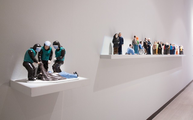 Così come accade con El Shaab (2012) di Nasr, una serie di statuette in ceramica che dovrebbe rappresentare, come dice il titolo, il popolo egiziano, e più precisamente il popolo che passa quotidianamente da piazza Tahrir e che di quella piazza, durante le proteste, è stato protagonista. Donne, uomini, ragazzi, famiglie, religiosi, persone in carrozzella, perfino lo stesso Nasr a braccia conserte, tutti allineati come per una rassicurante passerella in proscenio. Ma tra queste 25 figurine, qualcuno è ferito e soprattutto, staccato dalla passerella e posto a un significativo dislivello, ecco un gruppo tutt’altro che rassicurante: tre poliziotti che inferiscono su una ragazza a terra. Eccolo, il popolo delle statuette: ecco il popolo, dice Nasr. Che è un campionario di gente che rivendica eretta e con dignità la propria centralità e le proprie differenze, salvo scoprire in un angolo la violenza del potere esercitata su quelle stesse persone. Le statuine, seducenti nella loro grazia, si trasformano in schegge drammatiche di realtà, sferzando il lindore asettico dello spazio espositivo.