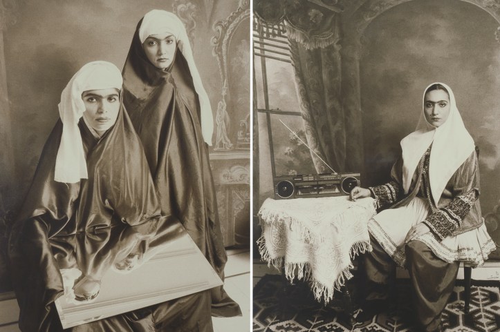 La grande aspettativa rispetto a una mostra concepita come un focus geografico in un’area che vive, anche in maniera devastante, fortissime tensioni tra tradizione e modernità è che l’arte sia capace di interpretare questo dissidio, magari riuscendo a suggerire sintesi poetiche. La mostra scardina questo preconcetto, che sembrerebbe perfino suggerito dal pannello iniziale che accoglie il visitatore mettendo a confronto la “scoperta” napoleonica dell’Egitto con tre piccole teche in cui sono conservati oggetti artistici attuali come fossero reperti archeologici. Il confronto tra tradizione e modernità, invece, sembra eluso dagli artisti qui raccolti, che semmai trovano nell’adesione alla concretezza della realtà e nella politicità del loro gesto il vero senso dell’agire artistico. Forse, l’unica opera – o perlomeno la più eclatante – che allude al rapporto tradizione-modernità è la bellissima serie fotografica Qajar dell’iraniana Sadhi Ghadirian (nata a Teheran nel 1974): ritratti di donne eseguiti secondo la concezione estetica dei ritratti in studio di fine 800, ma nei quali sono collocati elementi moderni. Una donna è raffigurata accanto a una radio, altre due reggono uno specchio che mostra i loro volti da una prospettiva inedita. La potenza concettuale si sposa con la bellezza delle immagini rendendo al meglio proprio la riflessione su tradizione e modernità: ma forse non è un caso che queste opere risalgano a (poco) prima del 2000. E in un certo senso anche queste fotografie hanno una valenza politica: la scheggia di modernità tardonovecentesca inserita in una cornice ottocentesca non è un semplice appunto sull’evoluzione sociale o antropologica, ma un potente collegamento e corto-circuito tra l’era della dinastia degli scià Qajar e quella confessionale di Ali Khamenei. E comunque per “arte politica” va intesa non solo quella (molto presente nella mostra) che denuncia qualcosa, ma anche quella che, usando slittamenti di segni e oggetti, si relaziona direttamente con la realtà del suo tempo: che trova nell’evidenza dei reperti della realtà (qui la radio e lo specchio) il grimaldello per parlare della realtà altrimenti indecifrabile.