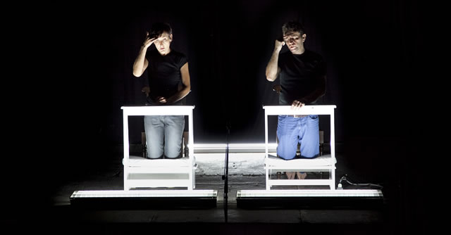 Non ci sono vie d’uscita nei testi di quotidiana.com, e neanche vie d’entrata. Le parole perimetrano lo spazio del pensiero in fulminei collegamenti che chiudono qualsiasi possibilità di evoluzione: il discorso, così, si affloscia, ristagna, riecheggia tra le pareti chiuse di parole e silenzi. Non ci sono vie d’uscita negli spettacoli di quotidiana.com, e neanche vie d’entrata. Paola e Roberto, semplicemente, stanno: non entrano in scena e non ne escono. Vivono rinchiusi nell’impalpabile confine della scena entro cui, a tratti, si muovono indolenti e rassegnati. Senza neanche percepire il confine perimetrale di quel quadrato perfetto, spesso delimitato da luci a terra, nel quale si trovano pochi oggetti dalla funzionalità stilizzata: due sedie e magari un tavolo, ovvero le condizioni minime della teatrabilità secondo una certa tradizione cinese. L’astrazione geometrica pura dello spazio è l’ambiente ideale per accogliere la geometria dei loro discorsi e della loro fisicità. Una fisicità apparentemente naturale, e invece innaturale nelle fissità delle pose a riposo o nei teatrini in cui «performare» (così dicono in Grattati e vinci) improbabili coreografie, che ricordano semmai i goffi balletti di Stanlio e Ollio, e che si fanno gioco delle convenzioni teatrali contemporanee (lui che si tira giù le mutande: «la fine del teatro»).