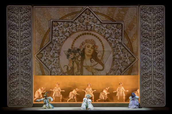 Il primo atto si apre con la visione di un gigantesco e prezioso soprammobile o bassorilievo. La gran parte della scena è occupata in verticale dalla proiezione dei volti femminili di Alfons Mucha alternati alle visioni pastorali di Joža Uprka che incastonano la storia in una cornice simbolica e georgica. Le immagini sono inserite all’interno di un rosone che si muove in senso antiorario, come a indicare il movimento rotatorio di un mulino (luogo dell’azione, secondo la didascalia del libretto originale, ed evocato musicalmente dal rintocco dello xilofono). Il rosone e le lesene laterali sono decorati con elementi floreali e stilizzati provenienti dalla biblioteca visiva del liberty. In basso, quasi schiacciato dallo schermo e dall’esuberanza visionaria di volti e paesaggi cechi di inizi 900, ecco un ambiente lungo e stretto, una sorta di corridoio o di fregio architettonico continuo, nel quale scorrono per tutto il tempo fluide figure femminili in una danza incessante e bidimensionale: un’ipnotica coreografia di Alla Sigalova dal sapore dei Ballets Russes e dalla plasticità di un altorilievo. Da questo “fregio” si staccano i personaggi, agghindati in sontuosi ed esuberanti costumi folkloristici firmati da Anna Watkins, che quasi ingigantiscono la figura e la decorano con stoffe a vivaci colori e ricercati cappelli. A un certo punto il grande schermo superiore si apre per mostrare, al di là, una gradinata razionalista, che ricorda vagamente (per rimanere in quest’epoca) i bozzetti scenici di Adolphe Appia, sulla quale sta il coro, anch’esso vestito con ricchi costumi diversificati per ciascun corista. Il racconto di Jenůfa viene calato da Hermanis in un’ambientazione che si confronta con gli stereotipi di una certa rappresentazione decorativa e folkloristica di novelle a sfondo etnico, ma al tempo stesso ne propone una contestualizzazione storica, e soprattutto se ne allontana con uno sguardo fondamentalmente di distacco ironico. Il cromatismo e la sovrabbondanza dei costumi e la loro evidenza territoriale sono centrali nella definizione di un immaginario stereotipicamente pseudo-documentaristico, mentre d’altra parte le nuances color sabbia del “fregio” e delle danzatrici e soprattutto il mastodontico schermo che le sovrasta fanno slittare la contestualizzazione dall’atmosfera agreste atemporale a quel periodo storico di grande elaborazione artistica e intellettuale che accomuna Mucha, Janáček e tanti altri protagonisti delle avanguardie pre-avanguardistiche mitteleuropee di inizio 900. Insomma, spiazzamento e ironia. Che sembra avere un ulteriore rimbalzo nell’attitudine dei personaggi a cantare quasi sempre inginocchiati o seduti, e sempre schierati in parallelo al boccascena: eliminando, cioè, al tempo stesso la verticalità (peraltro già inibita dal soverchiante schermo Art Nouveau) e la profondità. Jenůfa, la matrigna, la nonna, i due contendenti, ci appaiono come statuine di un affresco popolare, che racconta una ‘banale’ storia sentimentale da racconto condiviso a mezza voce durante le veglie dopo il raccolto: guarda, quella è la ragazza rimasta incinta che sperava di sposare il suo amato; quella è la matrigna dura e arcigna; quello è il fidanzato, un poco di buono; quell’altro è il rivale che finisce per sfregiare la povera fanciulla… quante ne avranno sentite i nostri avi contadini di storie così? E quanto è ironico, oggi, nel 2015, raccontarlo, e farlo sottolineandone in modo abnorme la provenienza paesana? Il primo atto è potentemente, prepotentemente, anti-realistico: la proiezione ideale di una storia senza vero spessore, stilizzata nei suoi elementi visivamente più eclatanti, perfino nella prossemica.