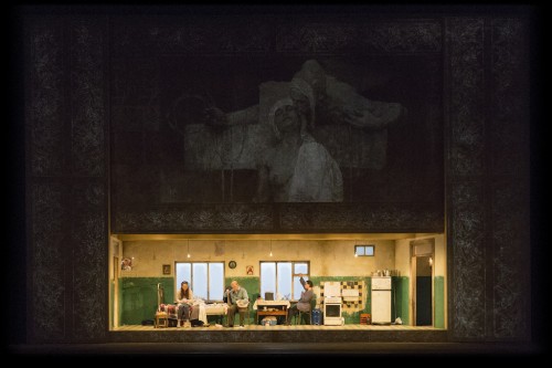 Il secondo atto cambia radicalmente prospettiva concettuale. Scomparsa ogni cornice visionaria, rimane in luce solo lo spazio oblungo del “fregio”, che però adesso ospita la povera casa della protagonista in un verismo estremo e in un potente slittamento temporale verso l’attualità. Siamo in pieno verismo, con soluzioni che, in questo contesto, riportano immediatamente ai primi esperimenti di André Antoine: la madre pela davvero le patate e accende il fornello della cucina, che sostituisce la stufa prevista da Janáček nelle didascalie del libretto (che Hermanis non aveva preso in considerazione nel primo atto). La fiamma azzurrina del gas che esce dalla stufa alimentata da una vecchia bombola a vista racchiude il senso di una scenografia in cui campeggiano un frigorifero, un piccolo televisore sempre acceso, immagini sacre con i lumini elettrici e così via. Dalla stilizzazione tra il simbolico Mucha e il bucolico Uprka del primo atto piombiamo in un verismo materico che riporta indietro negli anni (verso il Théâtre Libre di Antoine, appunto, cioè alla fine dell’800), ma che ci proietta anche in avanti, verso un immaginario realistico cinematografico che da certe pellicole americane del muto approda al nostro neorealismo. O, meglio, a un realismo lacrimoso alla Matarazzo, perché è comunque di melodramma che stiamo parlando. La cornice verista serve a contenere l’apice drammatico (e melodrammatico: anche per la presenza di alcuni momenti musicali e canori particolarmente intensi, sostenuti soprattutto dalla vocalità e dalla presenza di Angeles Blancas Gulin, il soprano interprete della matrigna, e dalla direzione di Juraj Valčuha). E’ in questo atto che il raccontino sentimentale e gli infingimenti del primo atto giungono alla loro svolta. E’ qui che la realtà (anche quella più cruda) prende il sopravvento, facendo svanire le apparenze viste in precedenza: la matrigna uccide il neonato, il bellimbusto mostra il suo vero squallido volto, lo sfregiatore dimostra la sua più profonda umanità. La realtà reclama una rappresentazione iperrealista: ma, si sa, l’iper forza il realismo, e ancora una volta la realtà sfugge… Dall’ironia del primo atto, espressa attraverso il folklore e l’Art Nouveau, si arriva così all’ironia del secondo atto, espressa da un verismo artefatto, dove la fiamma della stufa e dei fornelli è talmente plateale nella sua anomalia teatrale da slittare dallo statuto della realtà a quello della rappresentazione, dal verismo a un nuovo simbolismo. In una presunta attualizzazione che suona ulteriormente falsa, o meglio parziale: una scheggia di Cronaca Vera o trash tv completamente avulsa dalla realtà. Ma è evidente che proprio il confronto tra l’ambientazione del primo e quella del secondo atto porta in primo piano il senso centrale dello spettacolo: l’interrogazione sulla rappresentazione della realtà, o meglio quella che all’inizio ho definito l’ossessione dell’adesione alla realtà. Perché lo spettatore dovrebbe sentire più aderente alla realtà il secondo atto rispetto al primo, se si tratta della medesima storia? Cosa dà il senso di realtà: una storia o la sua narrazione visiva? E dunque, la realtà è data dall’immagine? Le domande nascondono una scorrettezza ideologica, ne sono consapevole, ma il punto non cambia: davvero la nostra percezione di un realismo riconoscibile della rappresentazione dipende dall’immagine anziché da ciò che accade, e quindi avvertiamo come “vero” questo secondo atto rispetto a un primo atto artefatto?