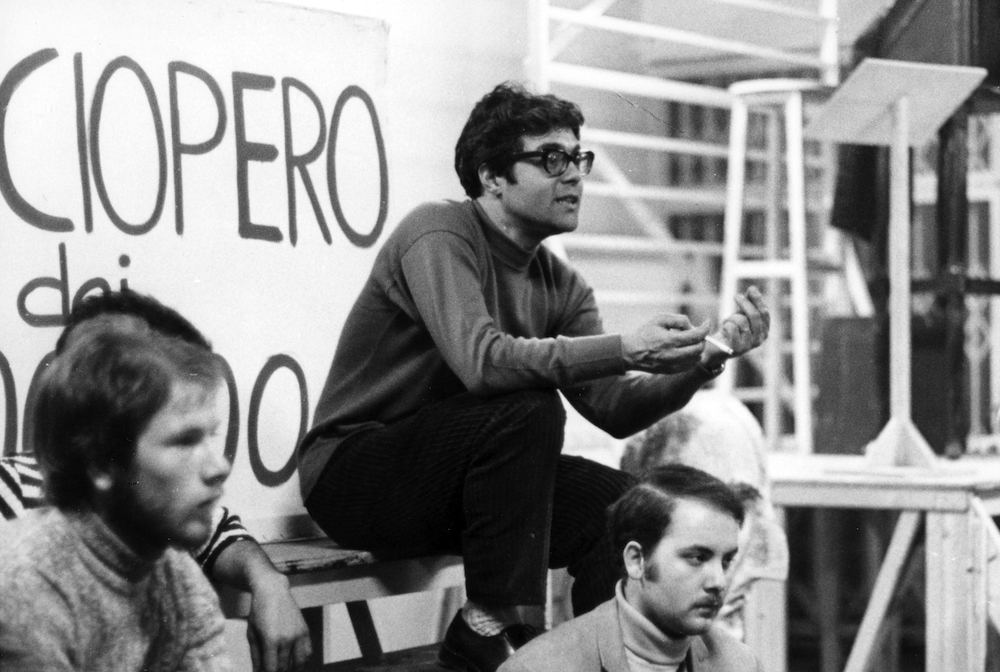 Il Teatro Vagante vaga da tanto tempo: in fondo Scabia ha sempre pensato e creato teatro in questo modo: vagando. Dentro e dintorno. Ma sempre sulla soglia di quell’Eden che Dante invece decise di penetrare. Perché quando ci sei dentro, conosci la realtà. Mentre quando stai lì, sul limite, la realtà puoi immaginarla (“Perché realizzare un’opera quando è così bello sognarla soltanto?”, dice Pasolini pittore giottesco nel Decameron), girandoci attorno, trovando sempre nuove prospettive inaudite e impreviste da chi entra dentro, brutalmente, nella vita, senza vaghezza di cercare ma solo di trovare. Il fatto è che, come molti altri inventori di altri teatri, anche Scabia è un intruso, un migrante senza permesso di soggiorno, che viene da lidi lontani, un diverso che non ha cercato di omologarsi, ma che ha marcato la sua differenza: e grazie a questo ha fecondato la realtà che ha trovato. Il Teatro Migrante di Scabia nasce dalla poesia, perché Scabia è stato e rimane prima di tutto un poeta, e grazie a questo, è stato e rimane dopo tutto un inventore di teatro. Lo ha scritto in modo fulminante Fabrizio Cruciani: “in realtà Scabia non fa teatro di poesia, fa teatro del suo essere poeta”. Da poeta, Scabia si affaccia alla scena, attraverso una porta a sua volta eccentrica, quella del teatro musicale di Luigi Nono. Vagando all’ascolto degli operai dell’Italsider, dando loro la voce – rimodulata dalla composizione poetica del libretto – sul palcoscenico della Biennale.