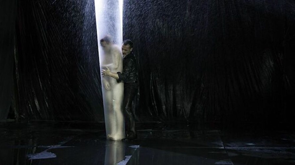 Ink è sotto il segno dell’acqua. Che sgorga incessante da un irrigatore a pioggia e si sparge sul terreno ricoperto da grandi lastre di plexiglass. A manovrare l’attrezzo è un uomo vestito in nero (lo stesso Papaioannou), come nero è l’intero spazio, chiuso da pareti di nylon color inchiostro. Il ‘guardiano’ dell’acqua è l’abitatore unico di un universo chiuso, che cura con disciplina secondo un disegno a lui noto, che non comprendiamo, spostando l’irrigatore, regolandolo, usando una boccia di vetro per raccogliere parte dell’acqua e redistribuirla sul pavimento diventato un acquitrinio o una laguna. Improvvisamente, dall’esterno, si insinua un’altra figura, inizialmente indistinguibile, mostruosa. Un altro uomo (Šuka Horn), nudo, che striscia sotto il plexiglass e che il ‘guardiano’ tenta di respingere o di contenere, cercando dapprima di rinchiuderlo in quelle stesse lastre.