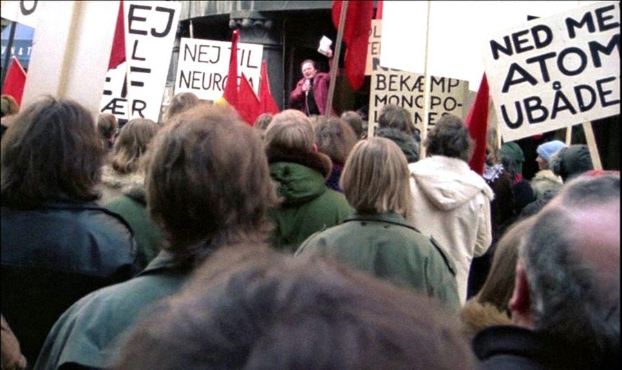 Dopo una pellicola indirizzata all’analisi della società contemporanea (The Seventies People del 1974 sui suicidi tra i giovani danesi), il nuovo bersaglio è l’energia nucleare, con Aftenlandet (Un paese al tramonto, 1976), uno dei lavori più estremi e spietati, più scioccanti e politici, più cupi e caotici di Watkins. Nel film si immagina che gli operai dei cantieri di Copenaghen scendano in sciopero bloccando la costruzione di un sottomarino destinato a portare missili atomici. Lo sciopero, la repressione della polizia, le ambiguità del potere, i gruppi terroristici che sequestrano i leader politici: un crescendo di stimoli davvero impressionante e «disturbante», ben sintetizzato da quel che scrisse un critico: «Quando imparerà Watkins a smettere di spaventare il pubblico?». Il film raccolse un coro quasi unanime di attacchi, dalla stampa conservatrice come da quella di sinistra che accusava il regista di parteggiare per i terroristi anziché per gli operai. Inutile accennare al fatto che un progetto attivato con la Rai subito dopo, nel 1977, per un film su Marinetti fu immediatamente abortito.