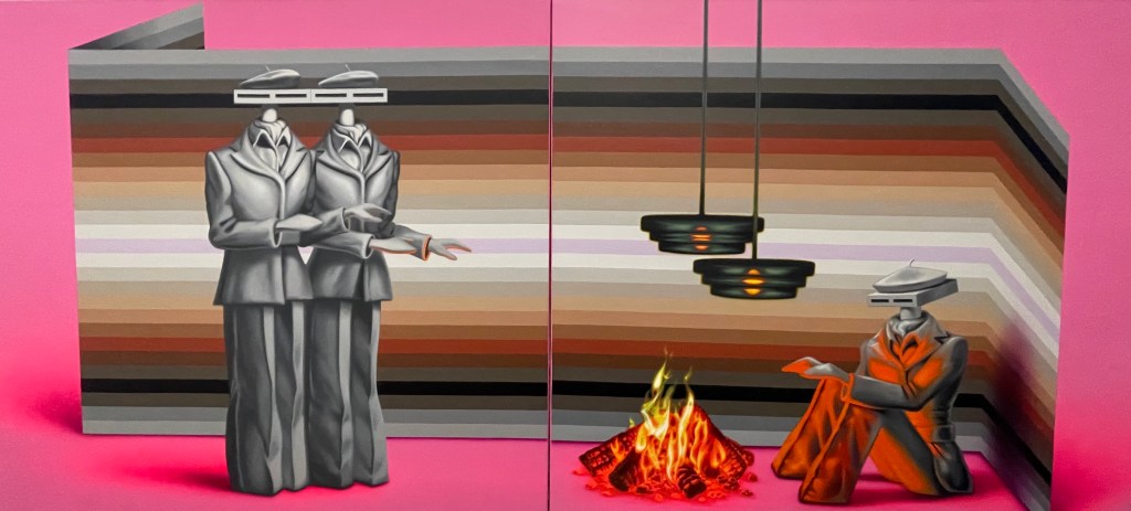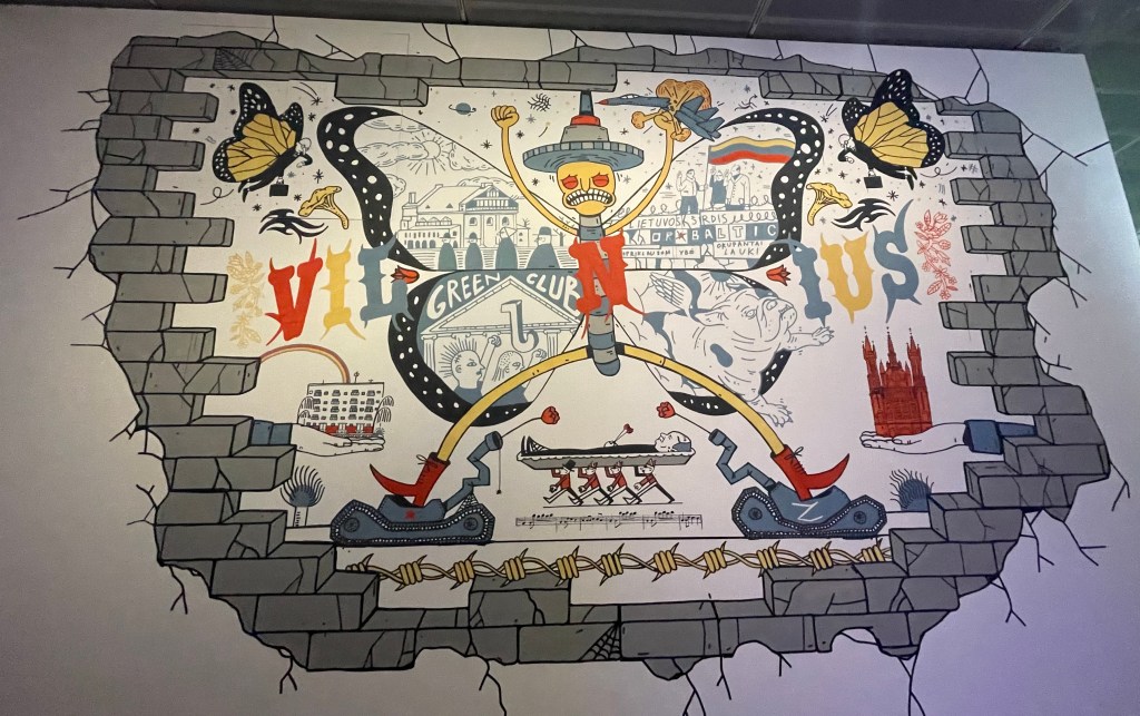 O forse infine, nell’opera Greetings from Vilnius dello street artist Antanas Dubra (2023) che racchiude in un vertiginoso affresco il passato, il presente, forse il futuro, di certo il visionario, il fiabesco, l’allegorico e il provocatorio, in un’immagine-rebus con il quale la mostra si congeda dal visitatore, che torna a guadagnare l’uscita inciampando su una vecchia panchina deformata (di Rimantas Milkintas, 2017) e su un improvvido tombino in rilievo. E vale la pena notare che quel vecchio e negletto tombino di ghisa, passato inosservato da quasi tutti, è in realtà Gilus įkvėpimas (Un respiro profondo), l’opera del più giovane espositore, Matas Janušonis, classe 1994, che forse più di ogni altro esempio ci racconta la complessa ironica sottile nascosta profondità della città, interpretata oggi dai giovani artisti pokeristi di Vilnius.