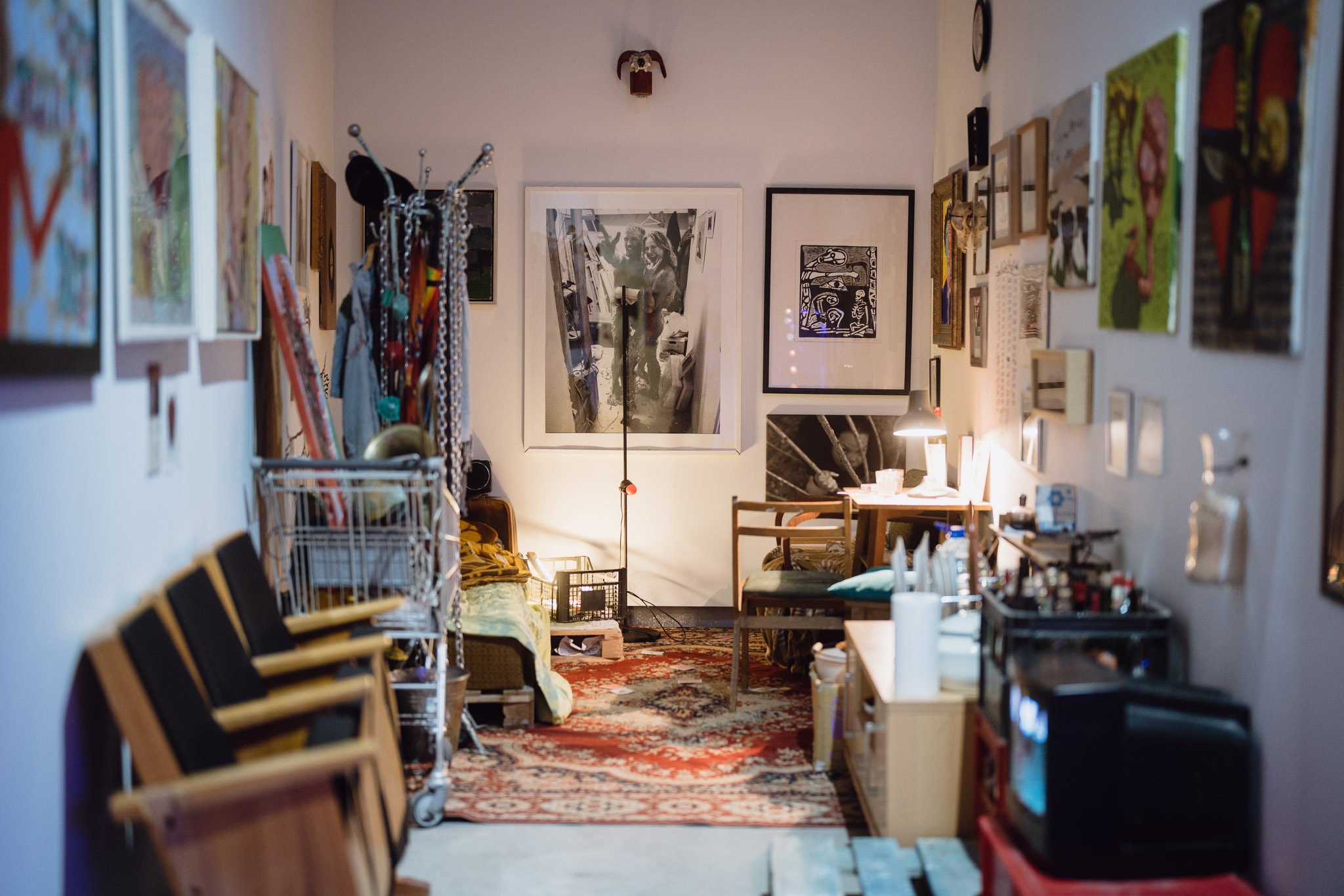 Ma insomma, dov’è e cos’è Vilnius oggi? Nel labirinto della mostra si incunea improvvisamente un’intera stanza: è l’installazione di Evaldas Jansas Random thoughts from the current situation (Behind the partition) (1998), ossia una camera in cui sono affastellati oggetti quotidiani e allusivi, un catalogo informe dove la quotidianità si trasforma in microcosmo universale, nel quale il visitatore è invitato a entrare, oserei dire in punta di piedi, a penetrare in una casa-mondo che svela e cela l’intimità, rinfacciandola allo sguardo altrui, come in una perlustrazione sul luogo del delitto o come in un mercatino dell’usato, dove trovi affastellati oggetti, sedie, tv, bottiglie, quadri, ricordi, cibo avanzato nel piatto, vestiti, un letto…