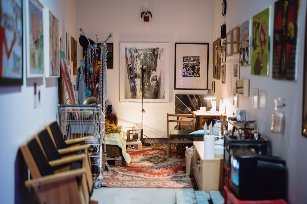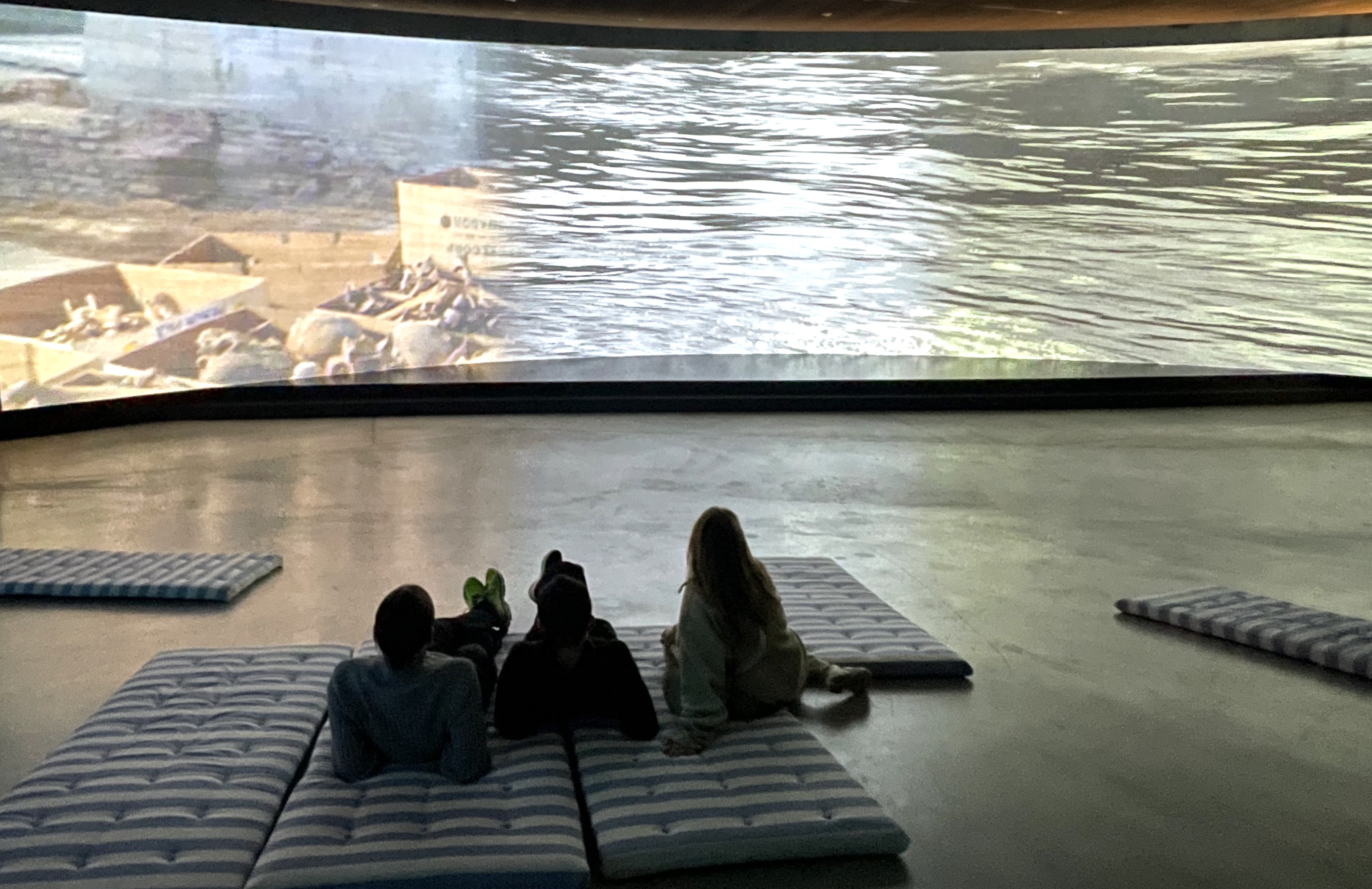 Un grande schermo avvolgente accompagna l’inizio della mostra, mostrando le tante immagini della città al pubblico invitato a sdraiarsi sui materassi: il video raccoglie estratti filmati della città, con la regia di Gediminas Lapė, e ha significativamente il titolo Il fiume. Un’opera che mi ricorda il docufilm di Eitvydas Doskus Once upon a Vilnius (2022), quasi una “sinfonia della città” contemporanea (non a caso in bianco e nero), che iniziava il racconto urbano proprio a partire dalle sue acque: un viaggio poetico dentro una metropoli a misura d’uomo, che osserva i suoi dettagli come fossero già pezzi di una stratificazione storica… once upon, appunto.