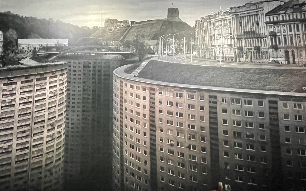 Ed è proprio la grande folgorante visione di Our Vilnius (2023), enorme stampa digitale di Liudas Parulskis, di 8 metri di larghezza e quasi 5 di altezza, ad accogliere i visitatori all’ingresso: nell’immagine, sotto la superficie di uno scorcio riconoscibile della città attuale, con l’iconica Torre di Gediminas che domina sulla piccola collina, si spalanca un baratro di palazzi sotto il livello stradale: decine di piani in una vertigine da grattacielo inverso che sprofondano nell’abisso, come a rappresentare forse, al tempo stesso, le radici di Vilnius e la sua proiezione futura. Non è un caso che si tratti probabilmente dell’opera più recente esposta, creata quindi proprio nel 700esimo anniversario, e dunque perfettamente calzante nel rappresentare più che Vilnius il senso dei suoi abitanti per la loro città e quella stratificazione, o meglio quella s-profondità nascosta che occorre riportare alla luce e sulla quale è fondata la realtà odierna, ma che si rivela essere come un livido falansterio di diversità rimosse. Come scriveva Gavelis in Vilnius Poker, “Chi non ha un passato, non ha neanche un futuro… Non siamo mai stati e non saremo mai… Non possiamo cambiare niente, perché non abbiamo un passato… Siamo un niente, un vuoto… Qualcuno ci ha rubato il passato, ma chi?”.
