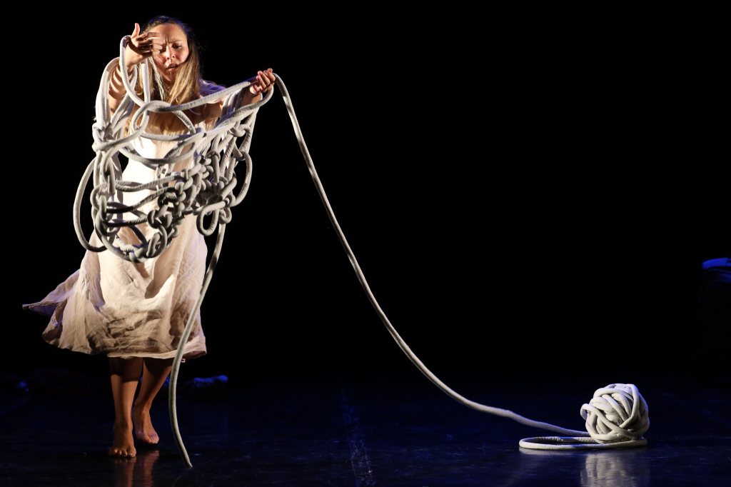 È il racconto di una migrazione, è il racconto di un’emancipazione, ma è anche, inatteso e tagliente, il racconto di un abuso sessuale, che probabilmente potrebbe essere stato alla base del soprannome di dileggio per cui aver subito violenza diventa agli occhi di una società patriarcale segno di donna di facili costumi anziché di vittima. Ed è un racconto di ribellione e di auto-affermazione nel momento in cui Tinta a soli 16 anni coglie l’occasione del salto nel vuoto della proposta di matrimonio con uno sconosciuto, prendendo in mano la sua vita. Ed è un racconto di responsabilità quando, incappata nuovamente in un reticolo di oppressione, sceglie un umile ma orgoglioso percorso di emancipazione, tutto femminile, e dunque identitario e alla fine vincente, come dimostrano i documenti (l’audio delle registrazioni di Tinta oggi, le foto di lei in Canada), e come dimostra con la sua stessa presenza Eleonora, che dialoga con la nonna da coetanea a coetanea, verrebbe da dire, raccogliendo il testimone affinché la micro-storia della quotidianità di una ‘ultima’ della scala sociale venga riconosciuta come parte della macro-storia fatta solo di nomi e cose maiuscole. E così Tinta emerge con pathos nel racconto fisico della performer, impegnata a manipolare per tutto il tempo una grande fune che esce dalla valigia in una lunga serpentina, diventando di volta in volta ricamo o manette, e che nella sua semplicità materiale simboleggia un’infinità di cose: la nave del viaggio, il lavoro sartoriale, i legami che imprigionano, il filo narrativo. Forse ciò che andrebbe ulteriormente sviluppato non è tanto la storia di Tinta, che il progetto mette bene a fuoco, ma il rimbalzo di questa storia in Eleonora, non tanto in quanto nipote ma soprattutto in quanto ragazza degli anni 20 del secolo dopo. Perché proprio questo è il punto nevralgico del progetto, la possibilità di una formidabile triangolazione tra teenager: la 16enne Tinta, così antica (il matrimonio per procura! la nave! la sartoria!) eppure così moderna per la sua volontà di libertà e di affermazione; la 16enne Eleonora (sia pure nella finzione rispetto all’attrice ventenne), che raccoglie la testimonianza e la fa propria con tutta la curiosità e la sorpresa del caso, fino a esserne narratrice e garante; e i e le 16enni e teenager che assistono allo spettacolo e che sono chiamati non solo e non tanto a conoscere questa storia, la storia delle donne o la storia d’Italia, ma soprattutto a comprendere come la propria esperienza si possa riflettere in quella di altre coetanee ricevendone stimoli. Al di là di possibili esempi concreti e auspicabilmente rari (come per esempio la questione della violenza o dei pregiudizi), è la scelta di Tinta che può toccare in maniera potente i teenager di oggi, cioè il suo voler e saper scegliere: ribellione e responsabilità, appunto. E per farlo è necessario che questo passi attraverso Eleonora, che forse può aggiungere al suo essere (nel progetto attuale) semplice testimone anche il suo diventare ‘sobillatrice’ di ribellione e di responsabilità.