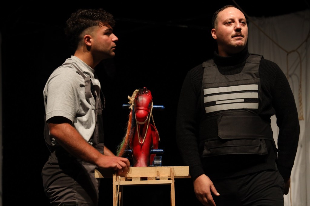 Per Atena! di Le Scimmie affronta il tema della guerra, giocando di sponda con l’Iliade, e più precisamente con l’episodio della costruzione del cavallo di Troia. La scelta dell’episodio, poco ‘spettacolare’ o evocativo, è singolare, ma come vedremo strategica per l’obiettivo. Lo spettacolo, infatti, sviluppa il dialogo tra un militare e il costruttore del cavallo: un dialogo condotto fin dall’inizio con accattivante simpatia (quasi una parodia), anche grazie alla provenienza napoletana della compagnia. Proprio la napoletanità sembra costituire il dispositivo teatrale più efficace, con il classico dialogo di coppia comica che trascina immediatamente lo spettatore (adulto) nella vertigine delle commedie di Eduardo o delle scenette di Totò. Ripeto: non è banalmente la cadenza napoletana a riportarci alla tradizione partenopea, ma piuttosto la scrittura drammaturgica e la composizione scenica che rievocano esattamente quel background. Questo aspetto non è secondario: sono infatti la simpatia, la spiritosaggine, la battuta a risucchiare gli spettatori nel gioco divertente. Il militare scandisce lo slogan “Per Atena!” invitando gli spettatori a unirsi il coro. E tutti, ovviamente, gridano insieme lo slogan, ogni volta che il militare lo dice. Un gioco spiritoso che crea un buffo cameratismo. Fin qui tutto bene, potrebbe essere una specie di – diciamo – Totò alla guerra di Troia, ma questo non è un film comico. L’artigiano, infatti, comincia ad avere qualche dubbio, prima con strani sogni sul cavallo, una sorta di Equus ligneo altrettanto affascinante-perturbante, che ci porta lentamente su un terreno di inquietudine come nel dramma di Shaffer. E poi con i dialoghi che proseguono col militare: insomma, il civile inizia a interrogarsi ingenuamente sulla guerra di cui diventa inevitabilmente parte, mentre il militare continua a caldeggiare la necessità dell’utilizzo dell’arma per arrivare alla fine della guerra con la distruzione totale della città assediata, non importa se con vittime civili, donne, anziani, bambini. [Assisto a questo progetto e scrivo queste righe proprio nei giorni in cui da una parte i militari convincono i politici europei a fornire sempre più armi per far finire una guerra devastante, e dall’altra parte viene portata avanti la distruzione totale di una città assediata con ormai oltre 40.000 vittime civili, donne, anziani, bambini… Era già tutto nell’Iliade?]