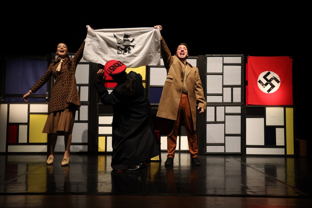 L’altro progetto ‘incandescente’ sul tema politico è Cuori teneri, anime forti: l’avventura antinazista dei fratelli Scholl di Misfatto a Palazzo. Il sottotitolo dichiara il soggetto, che ci porta immediatamente a un’epoca ma soprattutto all’identificazione di personaggi che sono simili agli adolescenti che costituiscono il pubblico di riferimento. Se Per Atena! interpella gli spettatori come pubblico di un qualcosa deciso da adulti, che minaccia e incombe, Cuori teneri punta a creare fin da subito un’identificazione del pubblico di teenager con i protagonisti, adolescenti anch’essi, non personaggi di fiction ma realmente provenienti dalla Storia. Il racconto di ribellione e responsabilità si presenta dunque, al contrario del precedente, non per metafora ma per esempio concreto, e dunque ripetibile. Anche perché va a intercettare una delle caratteristiche portanti della psicologia adolescenziale: l’aspirazione ad alte imprese, il coraggio e l’eroismo, la bellezza dell’atto assoluto. Strategico e riuscito è il dispositivo teatrale scelto, ossia una sorta di musical coloratissimo, ad alto tasso di empatia sensoriale, tutto schiacciato in uno spazio che esalta la bidimensionalità anche grazie a uno sfondo funzionale, modellato sulle geometrie di Mondrian e abitato da immagini e colori in chiave pop, dove spicca un isterico Hitler-muppet. Un immaginario visivo apparentemente lontano dall’oggi, sicuramente allusivo in parte di un certo passato storico, ma forse, proprio per la sua ‘anomalia’ rispetto alle iconografie contemporanee, capace di ‘bucare’ l’attenzione del pubblico adolescente. Che entra nella storia con una cornice che mi sembra essere l’unico punto fragile della costruzione: tutta la storia passa infatti attraverso una ragazza disabile degli anni ’80 (ma esordisce con un attualissimo e tiktokiano “POV”, che nega la voluta cornice temporale), che sarebbe la figlia della sorella di Sofie Scholl (questo il sottotesto non dichiarato, ma presente) e che chiede alla madre di raccontare ancora la storia di famiglia. Cornice concettualmente significativa, forse troppo per come aggiunge densità a qualcosa che non ha alcun bisogno di rinforzi né narrativi né scenici, e che invece rischia di venir presa come un inutile prologo che ritarda il nocciolo del discorso.