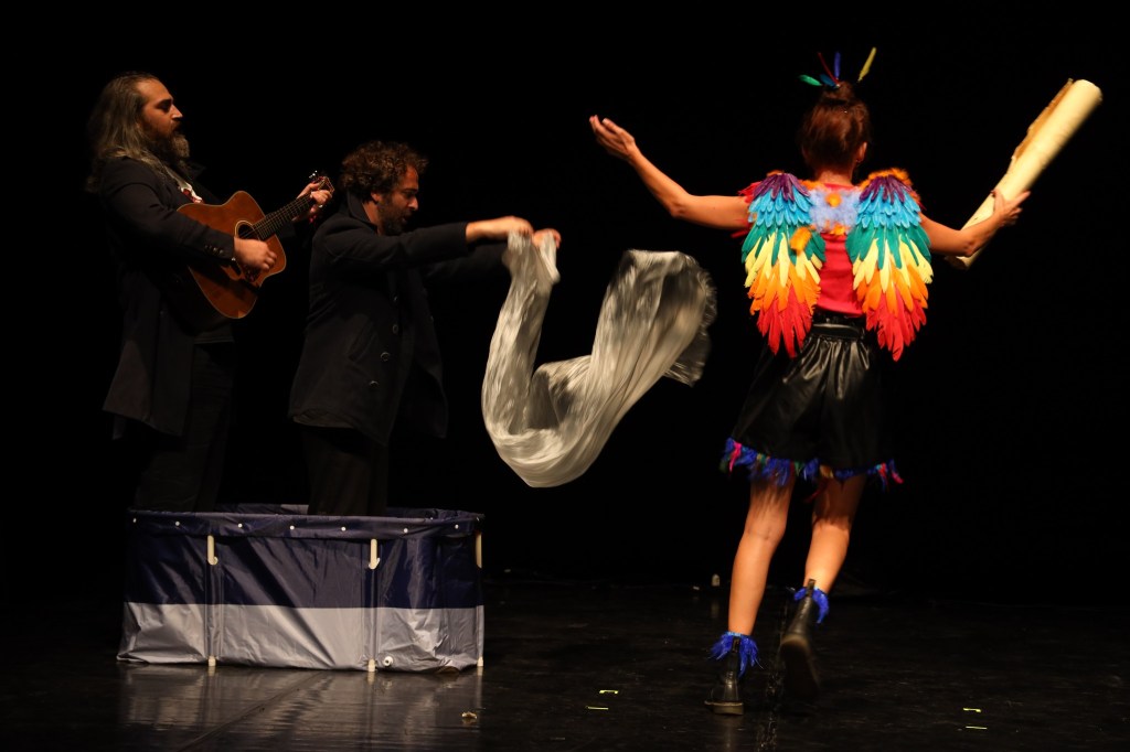 Nel progetto dal titolo bennatiano C.I.U.R.M.A.! – Pendagli da forca i tre Sea Dogs Plus raccontano, appunto, un’amicizia, un viaggio, l’incontro con fantastici animali. I due protagonisti decidono di riprendere in mano la loro fantasia infantile e diventare pirati alla ricerca del tesoro. In viaggio su una vasca da bagno che non sa di essere una vasca da bagno – e dunque, con la fantasia, può diventare una nave, così come il tè non sa di essere tè e può essere rum – incontrano prima di tutto una pappagalla, una sorta di variopinta e vivace Papagena che li accompagna attraverso mari e isole, dove avverranno incontri determinanti con altri personaggi (in questo caso pupazzi), come una tigre o una scimmia. Il tesoro finale sarà una frase che scioglie l’acronimo del titolo: “Che In Ultimo Rimaniamo Molto Amici”, segno ulteriore, dichiarato ancorché evidente dalla storia, che è proprio l’amicizia il centro e il motore dello spettacolo, che tira le fila rispetto ad altri spunti tematici di contorno, dalla questione ambientale (con la grande isola di plastica che si frapporrà nel viaggio dei pirati) al “turbo-capitalismo” incarnato da quella sorta di Mago di OZ che abita l’ultima e risolutiva isola della navigazione. E se questo è il centro dello spettacolo, va da sé che ne costituisca anche la caratteristica di fruizione, perché proprio gli spettatori bambini sono chiamati a essere la ciurma di accompagnamento dei due pirati, e quindi a unirsi in amicizia, creando una bolla comunitaria di valore positivo, destinata ad attraversare le – peraltro minime – avversità, subito ricondotte sempre a relazioni amicali (ancora il romanzo di Baum sembra essere un riferimento significativo a proposito delle modalità del viaggio che crea relazioni amicali), a cominciare dalla prima tigre in poi.