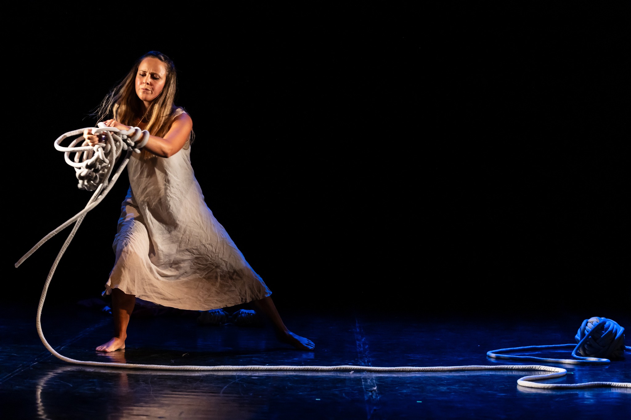 È il racconto di una migrazione, è il racconto di un’emancipazione, ma è anche, inatteso e tagliente, il racconto di un abuso sessuale, che probabilmente potrebbe essere stato alla base del soprannome di dileggio per cui aver subito violenza diventa agli occhi di una società patriarcale segno di donna di facili costumi anziché di vittima. Ed è un racconto di ribellione e di auto-affermazione nel momento in cui Tinta a soli 16 anni coglie l’occasione del salto nel vuoto della proposta di matrimonio con uno sconosciuto, prendendo in mano la sua vita. Ed è un racconto di responsabilità quando, incappata nuovamente in un reticolo di oppressione, sceglie un umile ma orgoglioso percorso di emancipazione, tutto femminile, e dunque identitario e alla fine vincente, come dimostrano i documenti (l’audio delle registrazioni di Tinta oggi, le foto di lei in Canada), e come dimostra con la sua stessa presenza Eleonora, che dialoga con la nonna da coetanea a coetanea, verrebbe da dire, raccogliendo il testimone affinché la micro-storia della quotidianità di una ‘ultima’ della scala sociale venga riconosciuta come parte della macro-storia fatta solo di nomi e cose maiuscole. E così Tinta emerge con pathos nel racconto fisico della performer, impegnata a manipolare per tutto il tempo una grande fune che esce dalla valigia in una lunga serpentina, diventando di volta in volta ricamo o manette, e che nella sua semplicità materiale simboleggia un’infinità di cose: la nave del viaggio, il lavoro sartoriale, i legami che imprigionano, il filo narrativo. Forse ciò che andrebbe ulteriormente sviluppato non è tanto la storia di Tinta, che il progetto mette bene a fuoco, ma il rimbalzo di questa storia in Eleonora, non tanto in quanto nipote ma soprattutto in quanto ragazza degli anni 20 del secolo dopo. Perché proprio questo è il punto nevralgico del progetto, la possibilità di una formidabile triangolazione tra teenager: la 16enne Tinta, così antica (il matrimonio per procura! la nave! la sartoria!) eppure così moderna per la sua volontà di libertà e di affermazione; la 16enne Eleonora (sia pure nella finzione rispetto all’attrice ventenne), che raccoglie la testimonianza e la fa propria con tutta la curiosità e la sorpresa del caso, fino a esserne narratrice e garante; e i e le 16enni e teenager che assistono allo spettacolo e che sono chiamati non solo e non tanto a conoscere questa storia, la storia delle donne o la storia d’Italia, ma soprattutto a comprendere come la propria esperienza si possa riflettere in quella di altre coetanee ricevendone stimoli. Al di là di possibili esempi concreti e auspicabilmente rari (come per esempio la questione della violenza o dei pregiudizi), è la scelta di Tinta che può toccare in maniera potente i teenager di oggi, cioè il suo voler e saper scegliere: ribellione e responsabilità, appunto. E per farlo è necessario che questo passi attraverso Eleonora, che forse può aggiungere al suo essere (nel progetto attuale) semplice testimone anche il suo diventare ‘sobillatrice’ di ribellione e di responsabilità.