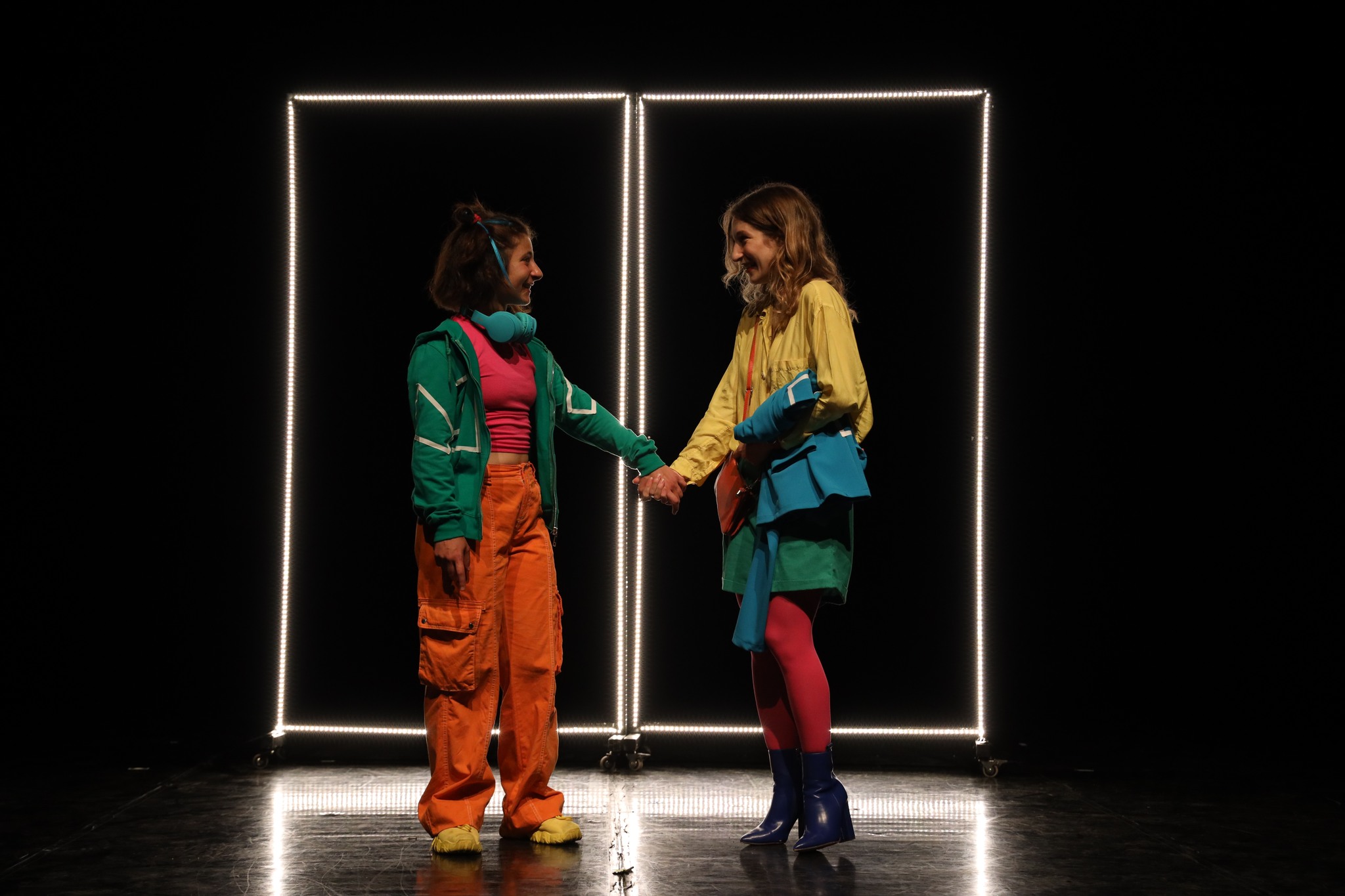 L’altro progetto ‘incandescente’ sul tema politico è Cuori teneri, anime forti: l’avventura antinazista dei fratelli Scholl di Misfatto a Palazzo. Il sottotitolo dichiara il soggetto, che ci porta immediatamente a un’epoca ma soprattutto all’identificazione di personaggi che sono simili agli adolescenti che costituiscono il pubblico di riferimento. Se Per Atena! interpella gli spettatori come pubblico di un qualcosa deciso da adulti, che minaccia e incombe, Cuori teneri punta a creare fin da subito un’identificazione del pubblico di teenager con i protagonisti, adolescenti anch’essi, non personaggi di fiction ma realmente provenienti dalla Storia. Il racconto di ribellione e responsabilità si presenta dunque, al contrario del precedente, non per metafora ma per esempio concreto, e dunque ripetibile. Anche perché va a intercettare una delle caratteristiche portanti della psicologia adolescenziale: l’aspirazione ad alte imprese, il coraggio e l’eroismo, la bellezza dell’atto assoluto. Strategico e riuscito è il dispositivo teatrale scelto, ossia una sorta di musical coloratissimo, ad alto tasso di empatia sensoriale, tutto schiacciato in uno spazio che esalta la bidimensionalità anche grazie a uno sfondo funzionale, modellato sulle geometrie di Mondrian e abitato da immagini e colori in chiave pop, dove spicca un isterico Hitler-muppet. Un immaginario visivo apparentemente lontano dall’oggi, sicuramente allusivo in parte di un certo passato storico, ma forse, proprio per la sua ‘anomalia’ rispetto alle iconografie contemporanee, capace di ‘bucare’ l’attenzione del pubblico adolescente. Che entra nella storia con una cornice che mi sembra essere l’unico punto fragile della costruzione: tutta la storia passa infatti attraverso una ragazza disabile degli anni ’80 (ma esordisce con un attualissimo e tiktokiano “POV”, che nega la voluta cornice temporale), che sarebbe la figlia della sorella di Sofie Scholl (questo il sottotesto non dichiarato, ma presente) e che chiede alla madre di raccontare ancora la storia di famiglia. Cornice concettualmente significativa, forse troppo per come aggiunge densità a qualcosa che non ha alcun bisogno di rinforzi né narrativi né scenici, e che invece rischia di venir presa come un inutile prologo che ritarda il nocciolo del discorso.